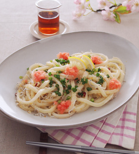 しらすの濃厚なうまみと明太子のピリ辛が麺にからみついておいしい、和風ペペロンチーノなうどん。