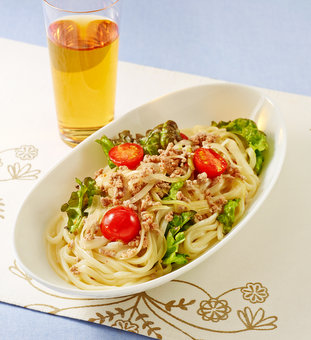 【A】と豚ひき肉、玉ねぎ、セロリ、ミニトマトをしっかり混ぜ合わせ、うどんを加えてよく和える