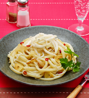 フライパンにオリーブオイルを熱し、にんにくと鷹の爪を弱火で炒め、にんにくがカリっとしたら取り出す