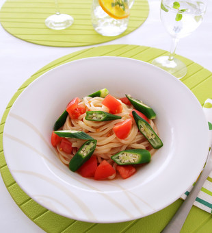 オクラとトマトの冷製パスタ風うどん