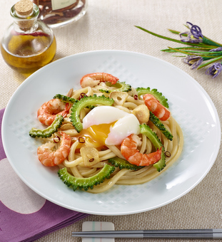 ほろ苦いゴーヤの風味とえびの風味がおいしいパスタ風うどん。