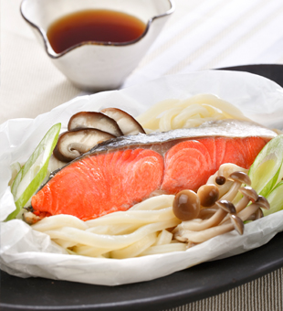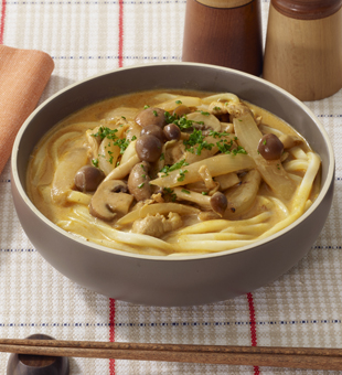 別のフライパンにサラダ油を入れて中火にかけ、うどんを軽く炒めて器に盛り付ける
