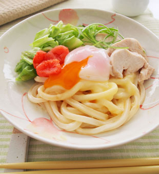 とろ~りチーズがからんだぶっかけうどんは、つゆも温めておくのがおすすめ!