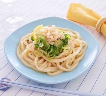 帆立缶とバターしょうゆを和えてつくる、旨みがおいしい簡単うどん。