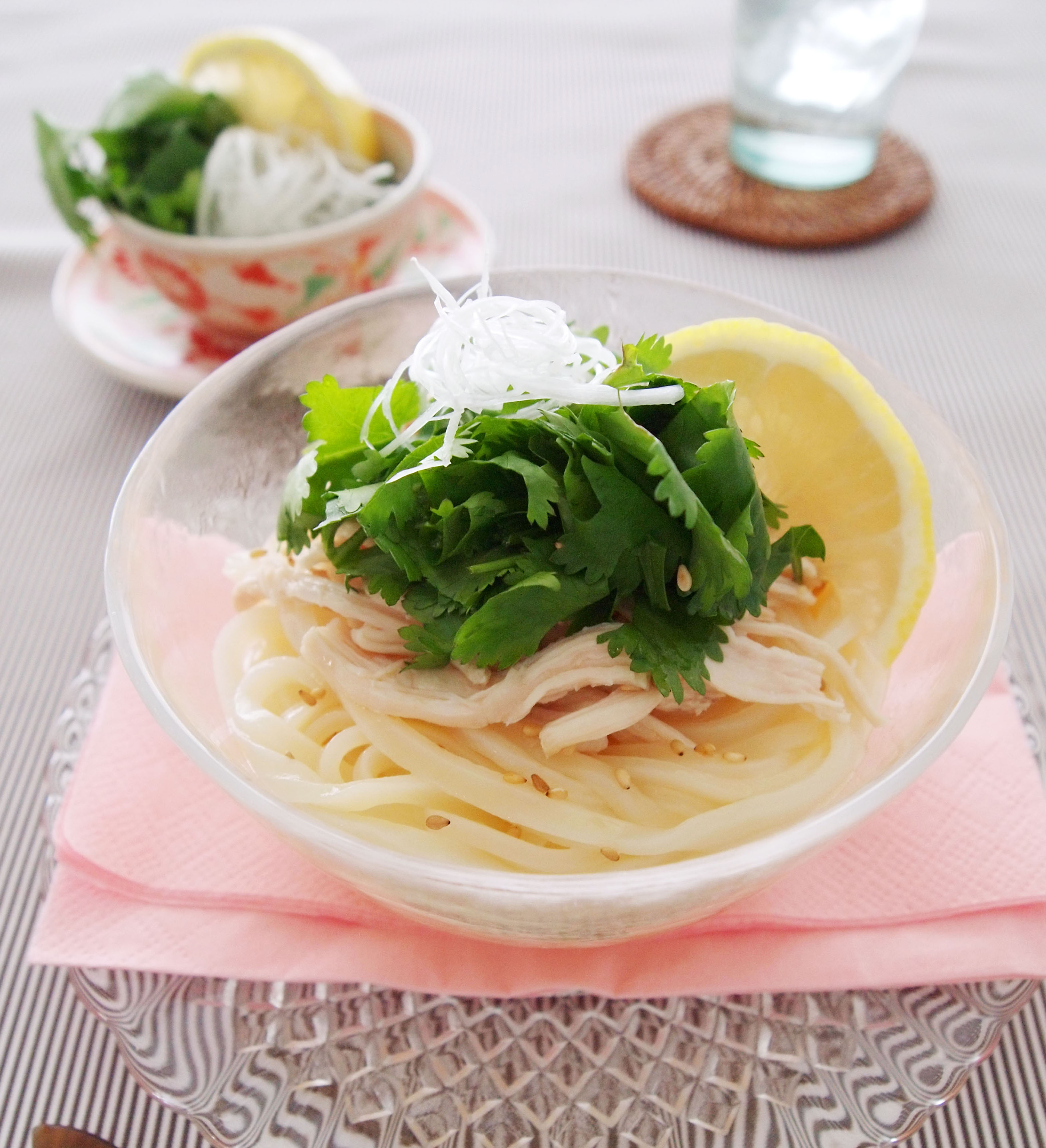 器にうどんを盛りつけ、鶏肉、パクチーの葉、白髪ねぎをのせる