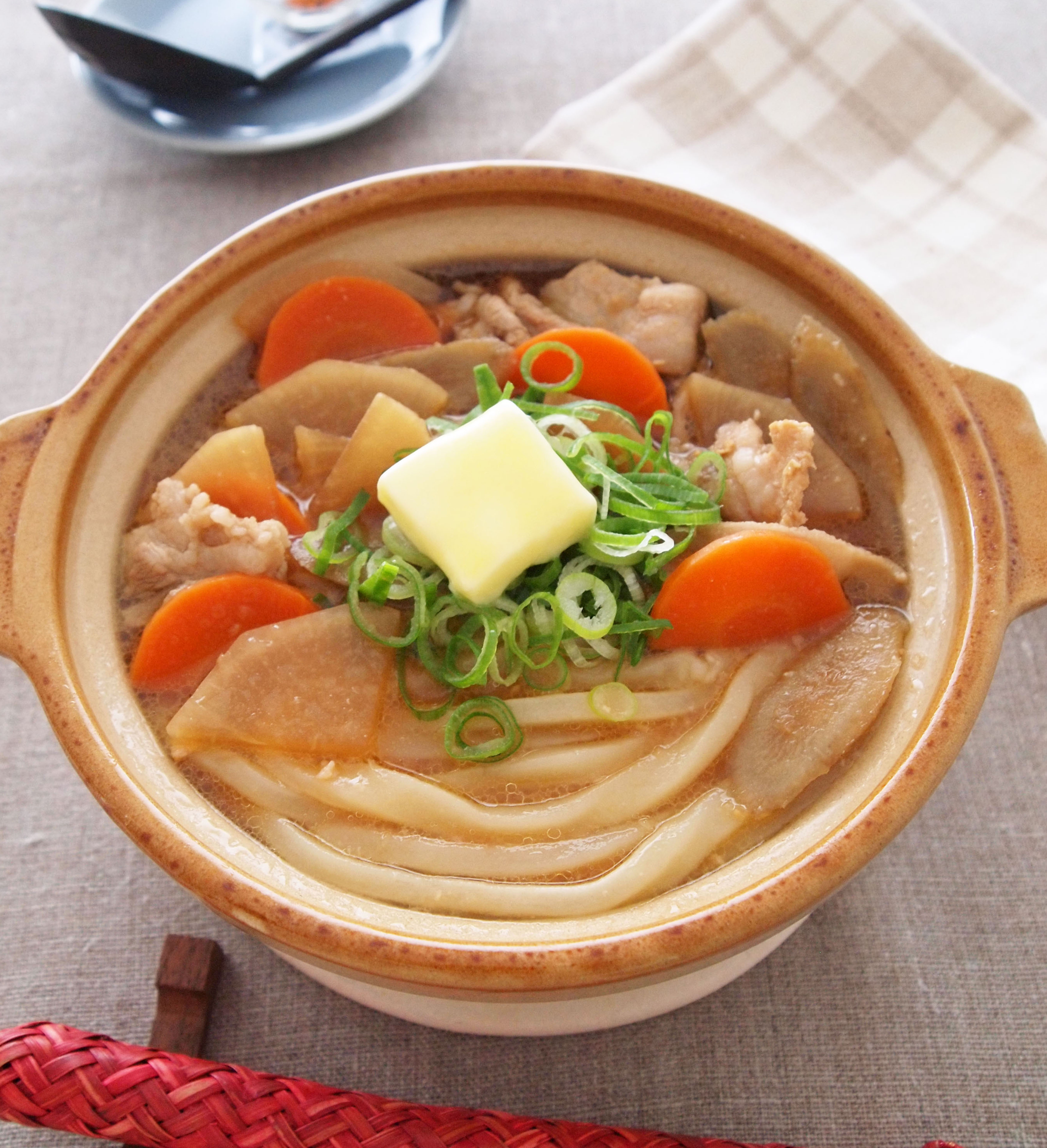 バターで香りとコクをプラスした、旨みたっぷりの豚汁風鍋うどんです。豚肉とごぼうをしっかり炒めるのがコツ。スープがとってもおいしくなります。