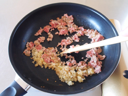 フライパンにサラダ油とにんにくを熱し、香りがたってきたら玉ねぎ、豚ひき肉を順に加え炒める