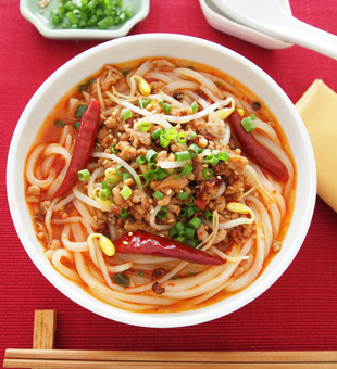 花椒のしびれるような辛さと唐辛子のピリピリするような辛さが特徴の「麻辣味」の四川風うどんです。花椒は中国山椒とも呼ばれ、辛さだけでなく、独特の香りもおいしさの秘密。手に入らない場合は、粉山椒のみでも作っていただけます。豆板醤、一味唐辛子など辛味がたくさん入っていますので、お好みで加減してください。