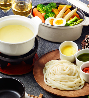 冬にうれしい、あったかチーズフォンデュうどん。カラフルなソースを添えれば、いろいろな味わいで楽しむことができます。