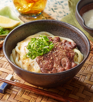 コシのある「さぬきうどん」と独特な噛みごたえのある牛タンをとろろがやさしくまとめてくれ、絶妙な味わいに仕上がります。