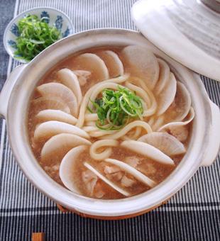 盛り付け用の鍋の中心にうどんを盛り付け、薄切りした大根と豚肉を周囲に並べる