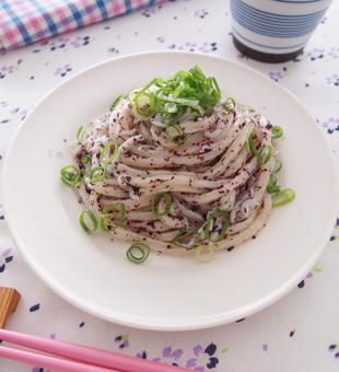 レンジでチンしてアツアツになったうどんにゆかりとバターを和えるだけ。