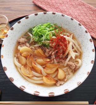 もちもちのコシのあるさぬきうどんに、にんにくの香りと旨みがからんでなんとも言えない本格的なおいしさになります。ぜひ作ってみてください。
