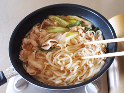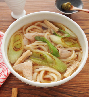凍ったままのうどんを一緒に鍋で煮る場合は、豚バラ肉とえのき茸を入れた後に再沸騰したところに加え、1分程度煮てください。