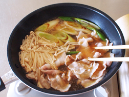 豚バラ薄切り肉、えのき茸を加えて火を通し