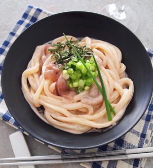 クリームチーズと塩辛を混ぜ合わせて、濃厚でクリーミーなうどんに。