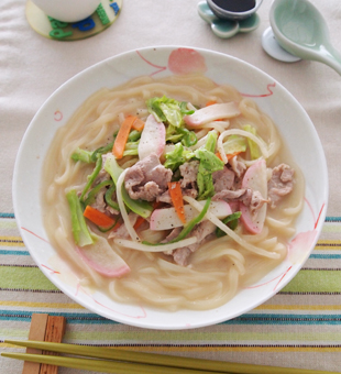 野菜のたっぷり入ったちゃんぽんうどんもレンジ1回で作ってしまいます!