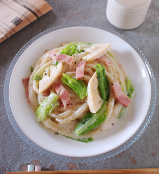 春キャベツとたけのこのクリームパスタ風うどん
