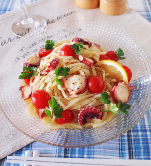 なめらかなのどごしで、コシのある「カトキチ極細さぬきうどん」は、冷たいパスタ風うどんにもおすすめです!たこやミニトマトの食感も楽しく、オリーブオイルとレモンの香りで暑い日でもさっぱりと召し上がっていただけます。