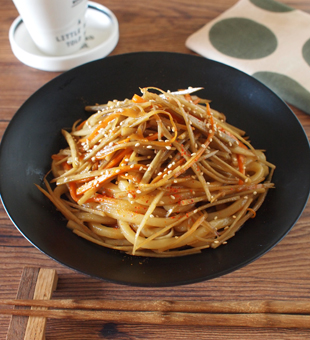 きんぴらのシャキシャキ、うどんのもちもちの食感がおいしい一品。