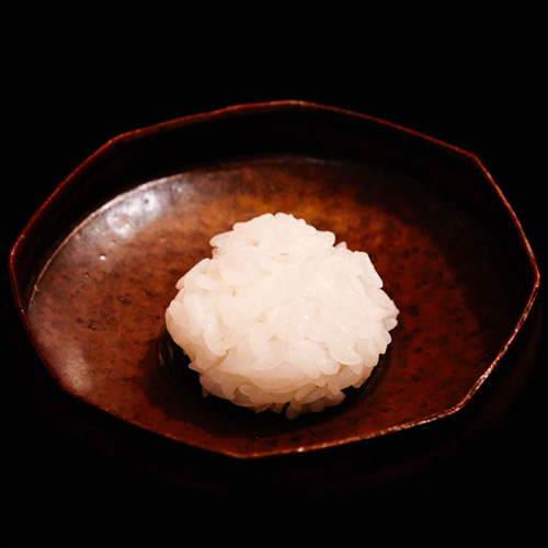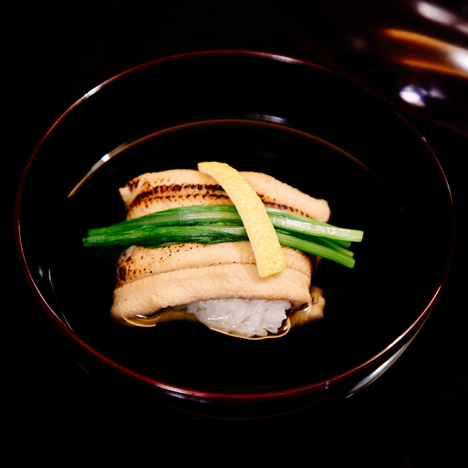 店主よりもともとお椀でご飯を使うものはありませんが、今回の献立の中で最初に思いついたお料理です。「新潟県産こしひかり」のやわらかめの食感とバランスの取れた食味といった特徴を生かすべく、ご飯に大和芋と塩だけを混ぜて椀種に仕立てました。穴子は下味を付けてやわらかく炊いて軽く炙り、ご飯に巻いています。鰹と昆布のだしに椀種が合わさり、味わいが変化していくのもお椀の味わいの楽しみです。