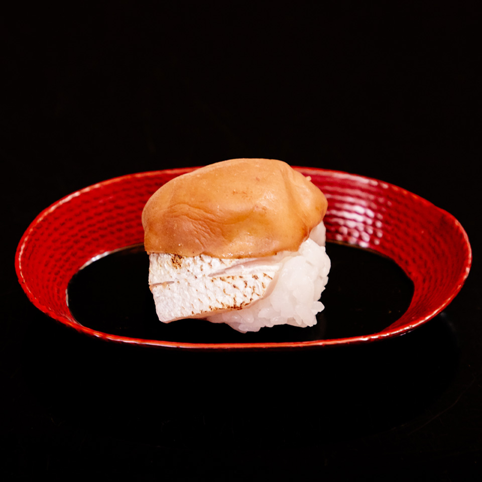 店主より秋から冬にかけておいしくなるカマスを、一口鮨にしました。選んだのは「山形県産つや姫」。粒感がしっかりしていて、つやがあり、かための食感があるのがその決め手です。ふっくら大粒の梅干しは毎年自分で漬けています。実をくり抜いて皮だけを使うのは、和食の古典の仕事。梅の皮の軽やかな酸味と塩気、おろしたてを軽く酢締めしたカマス、そして甘みと旨みのあるご飯。その組み合わせをお楽しみください。