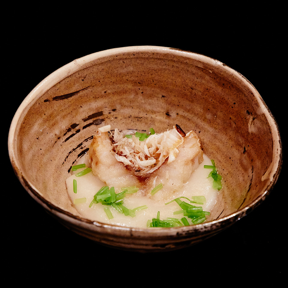 店主よりほどよくやわらかで、もっちりとした食感。そして豊かな甘みと旨みがある「北海道産ゆめぴりか」を、ソースとして仕立てたお料理です。ソースにするとお米の特徴がわかりやすいんですね。ご飯をだしで伸ばして、ミキサーにかけています。甘鯛は鱗揚げにして、サクサクとした香ばしい食感が楽しめます。甘鯛本来の上品な旨みに、ご飯のソースの甘みと旨みが加わり、唯一無二の新しい料理となりました。