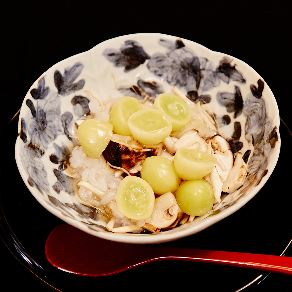 店主より飯蒸しは本来、もち米を使うお料理です。今回は、つや、甘み、粘りのバランスがよい「北海道産ななつぼし※」を合わせました。やわらかさや口当たり、香りのバランスもよいご飯です。せいろでご飯と松茸を蒸し上げて、温かい銀杏あんをかけていただきます。松茸のシャキシャキとした食感と香り、そしてご飯のもっちり感。ほろ苦くもふくよかな味わいの銀杏もたっぷり入り、秋の味覚を堪能できる一品です。