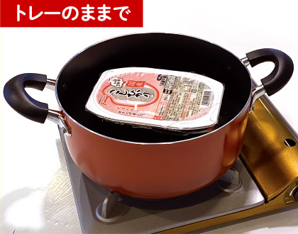 - ②パックごはんは開封せずトレーに入った状態で、フタ側を上にしてお湯に浮かべます。トレーは重ねないようにしてください。