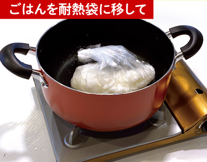 - ②パックごはんのフタをはがして、中身を耐熱袋に入れ、口を閉じてお湯に浮かべます。袋が鍋肌や底につかないようにご注意ください。