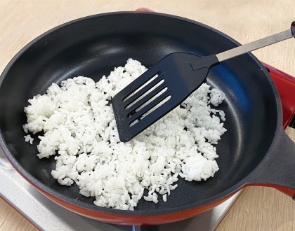 - ①フライパンに、パックごはんの中身と50mlの水(トレー約1/3杯分)を入れます。
