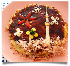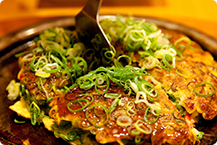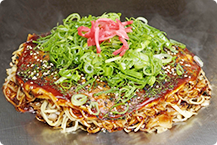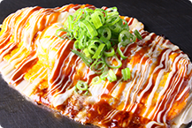 小麦粉を使わないお好み焼。溶いた卵を鉄板に広げ、キャベツ、もやし、豚肉等の具を巻き、たっぷりのソース、マヨネーズ、青のり、削り節をかけていただきます。ソースオムレツのような料理です。お好み焼屋さんの他、居酒屋メニューとしても親しまれています。