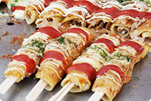 割り箸に巻いた串型のお好み焼。食べ歩きに人気のB級グルメです。大阪発祥説、九州発祥説、秋田の横手発祥説など諸説あるようです。