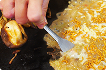 小麦粉を水で溶いたゆるいの生地を使うのが特徴。生地にソースを直接加え、キャベツ、桜えび、さきいか等の具材を混ぜ込みます。まず鉄板に具材だけ炒めます。ドーナツ状の土手を作り、土手の中央に生地を流し込み、生地が煮立ったら小さなヘラで具材と生地を混ぜながらいただきます。東京下町の駄菓子屋の店先で焼いていたのが発祥。現在はチーズ、明太子など具材も豪華になっています。