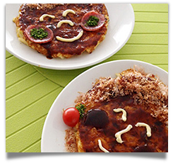 レンジで温めたお好み焼に、添付のソースやマヨネーズ風ソースで絵をつけたり、
