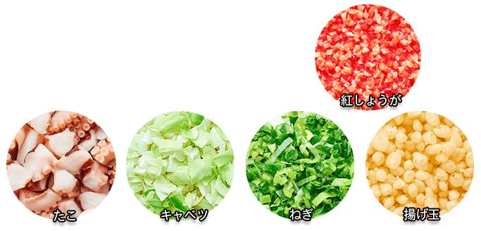 たこ焼は、たこ、キャベツ、ねぎ、紅しょうが、揚げ玉とシンプルな具材でできとるんやなコレ。