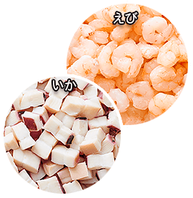 シャキシャキだけやない。いかやらえびやら、ぴっちぴちの新鮮な海鮮もたっぷり入れといたで!