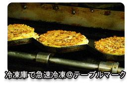 焼きたてのお好み焼は熱っついまんま、急いで冷凍室に放り込む!ここでな、やわらか食感と焼きたて風味を急速冷凍で閉じ込めるんや。