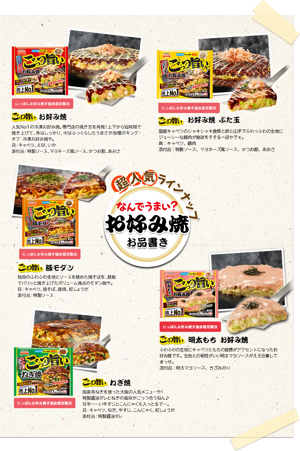 なんでうまい?コラム3 テーブルマークのお好み焼は、「にっぽんお好み焼き協会」認定製法です。