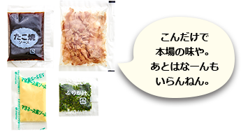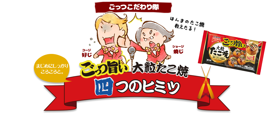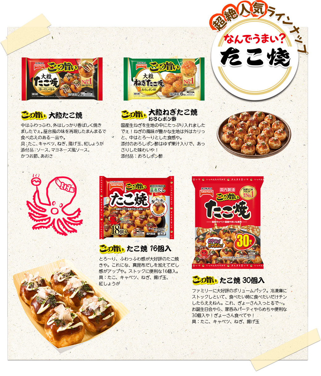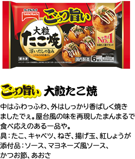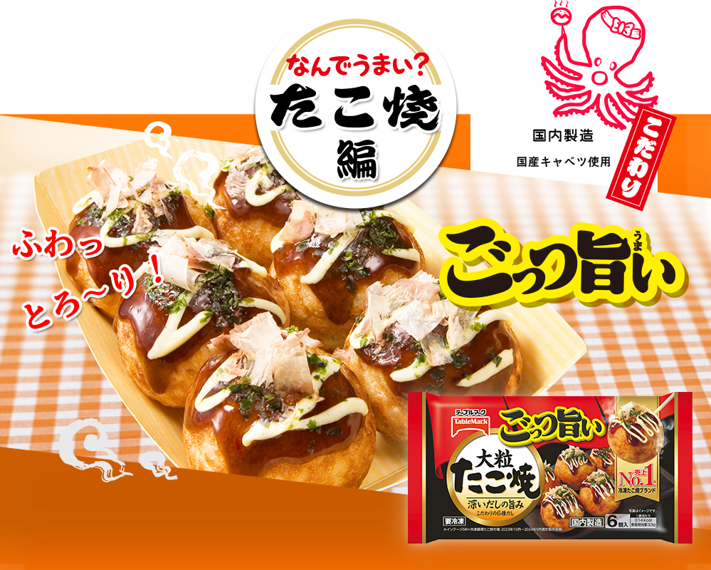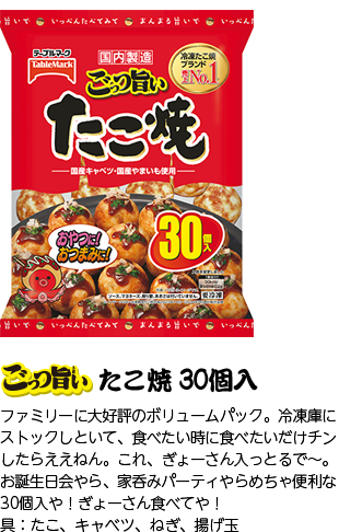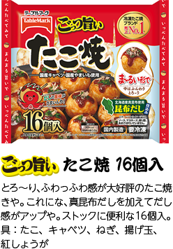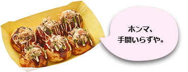 お好み焼に並ぶ大阪伝統の味ちゅーたら、あんた! 今やジャパニーズソウルフードのたこ焼やろ。外はカリッと香ばしゅーて、中はふわっふわ、とろ〜りやらかい、ほんでもって何っちゅーてもプリッとしたたこがうまさの証や。テーブルマークはなんとレンジだけでこのうまさを再現するんや! そのうまさのヒミツをどどどど〜んと紹介すんでぇー。