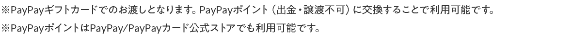 PayPayギフトカードでのお渡しとなります。PayPayポイント(出金・譲渡不可)に交換することで利用可能です。