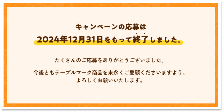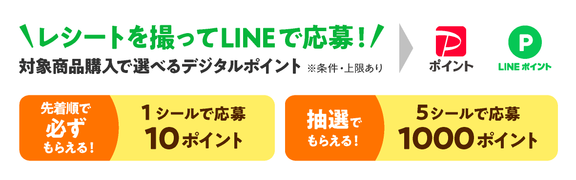 - レシート情報の読み取りに際し、キャンペーン事務局側での確認中に応募期間を過ぎた場合に関しては、2025年1月15日(水)23:59までご応募いただけます。また応募期間にためたシールが残っているお客様に関しても同様の時刻までご応募いただけます。