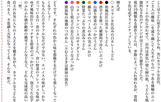 店主のお気に入りのJAZZを聴きながら、カラフルなうどんを食べると、不思議と元気になってくる、そんな一軒だ。
