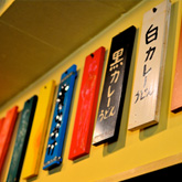 ご主人の趣味(を通り越して人生そのもの)である競輪のユニフォームの色に合わせて、店内は黄色い壁に緑の机、うどんも独創的な9色のアレンジがほどこされた創作うどんだ。現在16種類ある創作うどんは、季節によって入れ替わるが、常時9色は必ずラインナップしている。