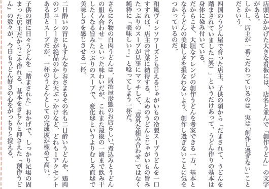 だからこそ、大胆なアレンジの創作うどんを考案できる一方、基本となるうどんの美味しさを損なわないよう、創作し過ぎないことに気をつかっているのだ。