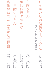 | じゃがいもの冷製スープうどん<ランチのみの提供> | 900円 |