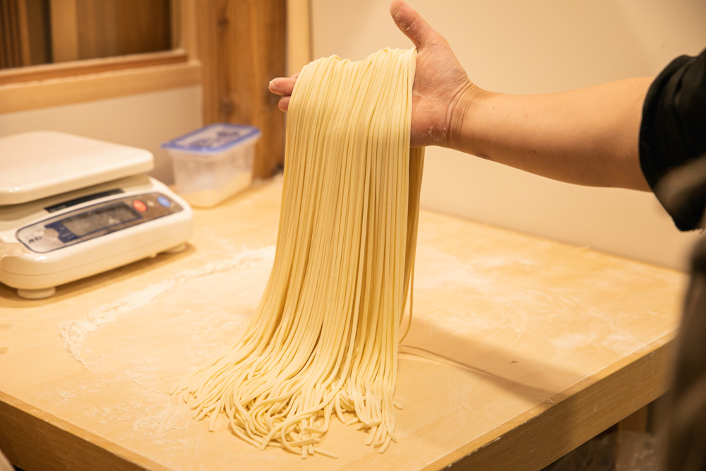 店内で毎日打っている麺は、ゆでる直前に機械で切り、そのまま釜へ。正真正銘の打ちたて・切りたて・ゆでたての「三たて」だ。