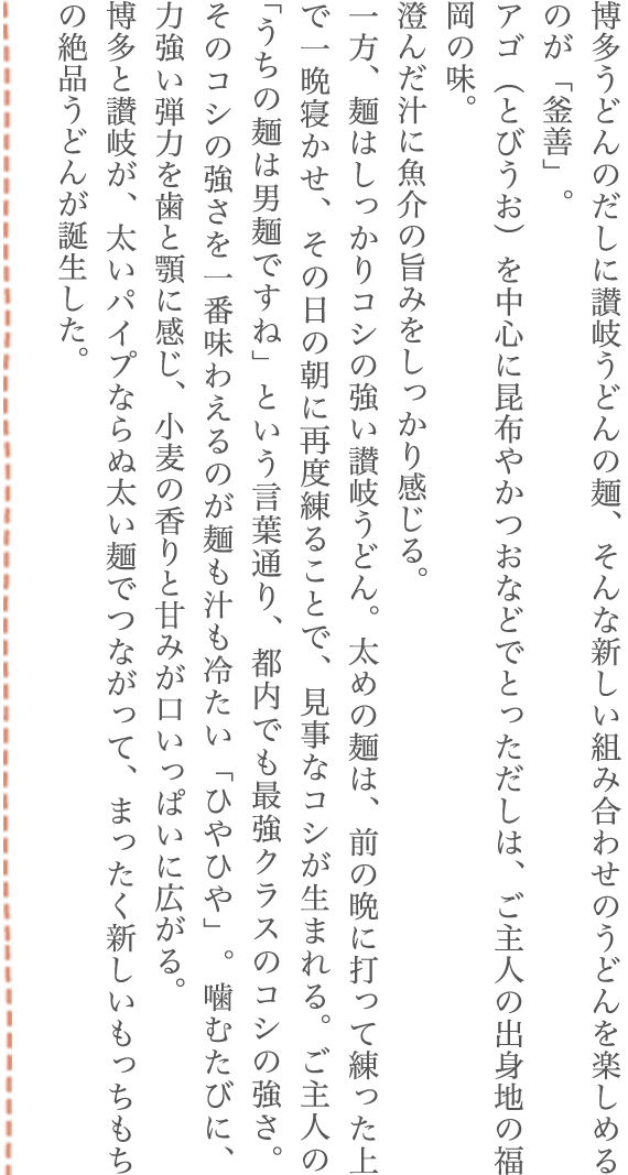 博多うどんのだしに讃岐うどんの麺、そんな新しい組み合わせのうどんを楽しめるのが「釜善」。