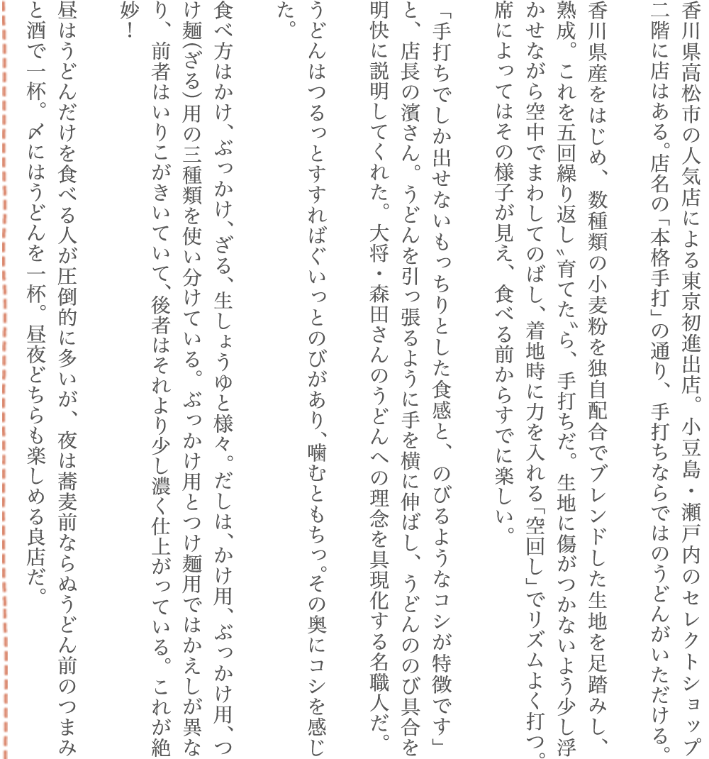 香川県高松市の人気店による東京初進出店。小豆島・瀬戸内のセレクトショップ2階に店はある。店名の「本格手打」の通り、手打ちならではのうどんがいただける。