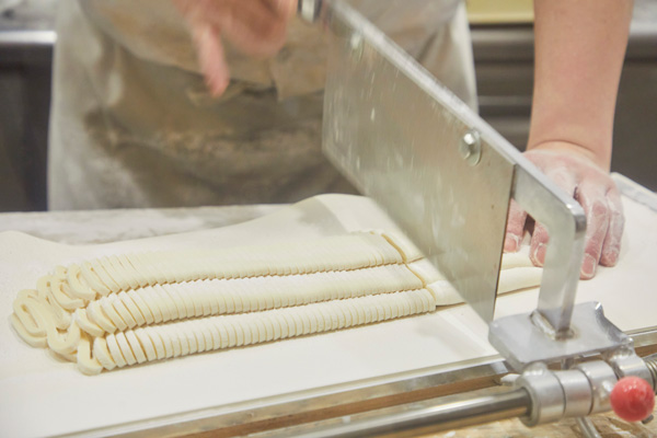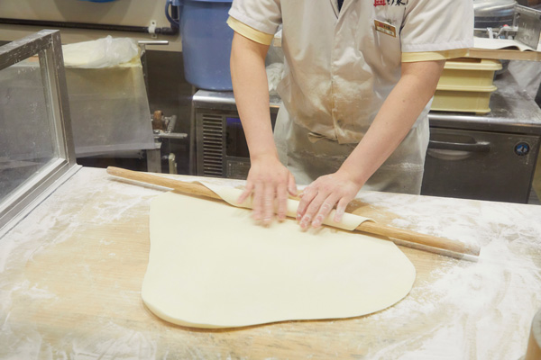 香川県産をはじめ、数種類の小麦粉を独自配合でブレンドした生地を足踏みし、熟成。これを5回繰り返し“育てた”ら、手打ちだ。生地に傷がつかないよう少し浮かせながら空中でまわしてのばし、着地時に力を入れる「空回し」でリズムよく打つ。席によってはその様子が見え、食べる前からすでに楽しい。